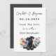 Spara datum bröllopsinbjudan med Schnauzer hund design. En svart hund ligger bland vilda blommor längst ner på vitt papper. All text är svart och mörkgrå och baksidan av kortet är enfärgat grått. Gör enkelt ändringar i typsnitt och färger med hjälp av designverktyget. Denna mindre storlek kan också konverteras till storleken 5x7. Välj också att dela dina inbjudningar online med hjälp av alternativet för direkt nedladdning.