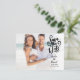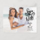 Detta moderna skript fotobesparingsdatumkort har ditt foto och ett dekorativt skript spara datum ovanför era namn, datum och lokal. Baksidan har ytterligare detaljer om spara datum, inklusive er bröllopswebbplats. Designad av Thisisnotme©