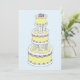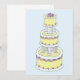 En flervånings, stilfull, pastellfärgad trevånings tårta mot en pastellblå bakgrund.