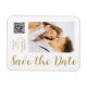 Spara Snyggten Date Black Guld Script Modern Bröllop Magnets har en svart bakgrund med anpassningsbarnas foto. Anpassa texten genom att redigera texten i de angivna textrutorna och lägga till webbadressen för anpassningsbarna QR-kod. Designad för dig ©Evco Studio www.zazzle.com/store/evcostudio