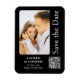 Spara Snyggten Date Black Guld Script Modern Bröllop Magnets har en svart bakgrund med anpassningsbarnas foto. Anpassa texten genom att redigera texten i de angivna textrutorna och lägga till webbadressen för anpassningsbarna QR-kod. Designad för dig ©Evco Studio www.zazzle.com/store/evcostudio