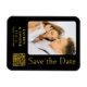 Spara Snyggten Date Black Guld Script Modern Bröllop Magnets har en svart bakgrund med anpassningsbarnas foto. Anpassa texten genom att redigera texten i de angivna textrutorna och lägga till webbadressen för anpassningsbarna QR-kod. Designad för dig ©Evco Studio www.zazzle.com/store/evcostudio
