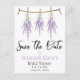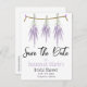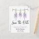Börja planera din bröllopsfest med en Spara datum-kort. Denna framsidesdesign har tre knippen lavendelblommor som torkar på en sträng med en enkel vit bakgrund på baksidan. Det är lätt att anpassa framside- och baksidetexten i mallfälten eller redigera med hjälp av designverktyget för att välja en typsnittsstil, storlek och färg som du föredrar.
