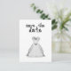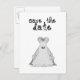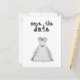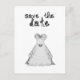 Detta vykort har "spara datum" i mitt typsnitt av tygbokstäver, skapat för min logotyp för min verksamhet, http://fabricatedframes.com , plus en silvergrå tonad klänning, bröllopsklänning, klänning med vid skört, hjärtformad bystlinje, strapless överdel, med skiktad, yvig skört, hjärtformad pärlbesatt broche på bysten centrerad, och på satinband vid midjan.