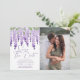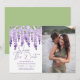 Fotospara Datuminbjudan Watercolor Wisteria Bröllop spara datum innehåller vattenfärgsblommor i mjuk lilak, lavender och lila med grön bakgrund med Spara datuminformationen nedan. Anpassa genom att redigera texten i de angivna textrutorna och lägga till ditt favoritfoto. Designad för dig ©Evco Studio www.zazzle.com/store/evcostudio