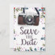 Spara datum Vintagekamera - Bröllopsinbjudan med ett blomsterrev.