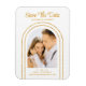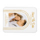 Spara Snyggten Date White Guld Script Art Deco Bröllop Magnets innehåller ditt favoritfoto i en gyllene båge på en vit bakgrund. Anpassa texten genom att redigera texten i de angivna textrutorna. Designad för dig ©Evco Studio www.zazzle.com/store/evcostudio