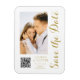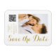 Spara Snyggten Date White Guld Script Modern Bröllop Magnets har en vit bakgrund med anpassningsbarnas foto. Anpassa texten genom att redigera texten i de angivna textrutorna och lägga till webbadressen för anpassningsbarna QR-kod. Designad för dig ©Evco Studio www.zazzle.com/store/evcostudio