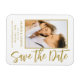 Spara Snyggten Date White Guld Script Modern Bröllop Magnets har en vit bakgrund med anpassningsbarnas foto. Anpassa texten genom att redigera texten i de angivna textrutorna. Designad för dig ©Evco Studio www.zazzle.com/store/evcostudio