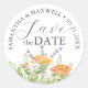 De här botaniska bröllopsklistermärkena har färgstarka vilda blommor i orange, lila och lavender med sprit av grönt. Orden "Spara datum" anges i trendigets typografi. Använda mallens fält om du vill lägga till personligens text. Ett charmerande val för bröllopsteman i vildblomsterträdgården och för använda som kuvertförseglingar. Om du vill se mer blommigt bröllop-leveranser som detta besöker du www.zazzle.com/dotellabelle Unik vattenfärgsgrast och design av Victoria Grigaliunas från Do Berätta A Belle.