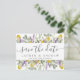 Meddela din speciella dag i färskt, romantiskt stil med Lemons och Lavender Spara datumkortet. Med ursprungliga vattenfärgsillustrationer av pulserande citroner, delikata lavandesprickor och lush grönt foliage, fångar den här designen perfekt den gedigna charmen med en Medelhavstvist. Ett vackert sätt för gästerna i ge att få en första glimt av bröllop, det är fullt anpassade med namn, datum och plats.