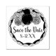 Rubber frimärke har en originalmarkörillustration av en friterad bröllop-kaka, med SPARA DATUM i ett typsnitt av roligten.