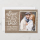 Meddela bröllop med det här visuella vykortet "Spara datum". Hand plockade-kalligrafi med hjärtan som målats på trä med ditt foto bredvid det. Ändra namn, datum, plats och annan information.
