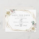 Bröllop spara datum | Geometriska terrariumformer i guld med elfenben och böner och benvita magnolias - guld geometriska multifasetterade terrarium i stil ram adorberade med grönenergi och blommigt bouquets. Reverse är ett kompletterande samordnat färg. Anpassa text, teckensnitt stil, färg och storlekt. Originalteckningar skapat för BarefootBride™ av © WhimsicalArtwork™ - Detta ingår i en komplett Bröllop Stationery Suite med matchande bröllop, babydusch och andra händelsematerial.