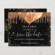 Ett giftigt och trendig Spara datumkortet för en Quinceañera, 15:e födelsedagsfesten. En klassisk svart bakgrund med faux guld glitter och ballonger. Anpassa och lägg till datum och namn/ålder. Texten: Spara datumet skrivs med ett stort trendig-handskript i stil.