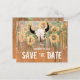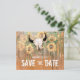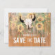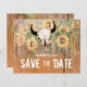 Budgeterat solrosor för bröllop spara datum meddelande,, platt kort. Western rodeo-tjallskalle med horn land blommigt struktur. Vintage av barrträ, grönt av brun gult. Konstruktion för bondduk stil. Upphovsrätt Marg Seregelyi Fotography.