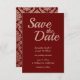 Ett rött eller burguddrigt rutmönster i mörk och blek i ro för rött dammmönster för bröllop spara datum. Contemporaryn Spara datumtexten är en underbar kalligrafi av stil. Bakgrunden bakom dammmönstret är ett digitalt förbättrat foto och inte en verklig metallfolie i ro guld