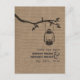 Ett vykort från bröllop spara datum med ett camping-/utomhustema med en svart illustration av ett oljelternt som hänger från träd gren med löv. Bakgrunden är inkapslad. Anpassa texten med information om tillfälle.
