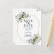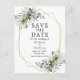 Modern Elegant Watercolor botanical Grey Rädda vykortet för datum omfattar eukalyptus löv, grönt botaniskt löv, dammiga blå löv och andra vackra botaniska grejer. Guld Geometric Ram.