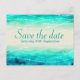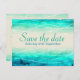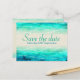 Spara datumet för bröllop-mousserande havs-vykort som målats i vattenfärgsblått turkos och grönt-havseffekt med en grafisk vågöverlagd gnistra på sandbotten. Original bröllop spara datum vykort. Perfekt för ett bröllop mellan strand, kust eller tropisk destination. En del av de mousserande haven bröllop. Sarah Trett har utformat en exklusiv för elegant.
