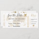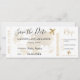 En modern och coola Spara datumskriptet världskarta flygplan-boardingkort i faux guld-folie och redigerbar enkel vit perfekt för destinationsbröllop.
