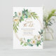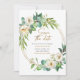 Det här vackra datumet sparar inbjudan med vackra vattenfärgsgröna, vita blommor och en guld-krans. Så elegant och söt! Matchande objekt i party är också tillgängliga. © Mini Moi-utskrifter