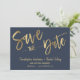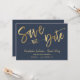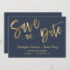 Den här inbjudan innehåller en faux-guld-folieeffekt med marin blå bakgrund. "Spara datumet" visas i faux-guld-folie, men guld-folie skrivs inte ut. Obs! "Spara datumet" och dess bilder kan inte ändras, redigeras eller tas bort. Du kan anpassa inbjudan genom att lägga till ett foto på baksidan av kortet om du vill. Du kan anpassa eller anpassa namnen i par och viss text, inklusive datum och plats. Du kan till och med ändra färg i bakgrunden från marinblå till valfri färg.