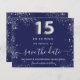 Ett trendig Spara datum för en Quinceañera, 15:e födelsedagsfesten. En marin blå bakgrund med faux silver glitter damm. Anpassa och lägg till datum och namn/ålder. Texten: Spara datumet skrivs med ett stort trendig-handskript i stil. Nummer 15 med ett silver-stil-teckensnitt.