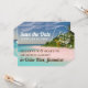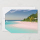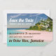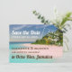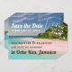 Spara datumet för ett bröllop på en strand eller ö-lokalisation formad som ett stort bagagemärke, med en anpassad personlig passstämpeldesign i hörnet. En mjuk sandstrand, lugnt turkost vatten och en frodig grön palmtoppskant som möter marken.