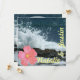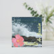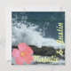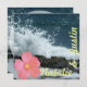 Tropiska stranden sparar datumet när vågar slår mot stranden, korall rosa hibiscus och roligt fet text. Perfekt sätt att tillkännage ett kommande destinationsbröllop vid havet.
