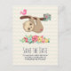 Spara vykortet för datum med en illustration med en söt brun lutning uppåt och nedåt. Den här lustiga lilla killen håller fast vid en gren som har en liten rosa fågel på ena sidan av gren och en udle-stil bukett med rosor på andra sidan. Under dem finns en arrangemang av färgstarka, handdragna blommor. Den här vackra slätten har också rosa rosiga kinder och tre söta små hjärtan på rumpan.