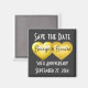 Den här kylmagneten har två guld-hjärtan (en med ett glasliknande utseende, den andra med ett vitt tvättat centrum) som täcks av malltext för namnen av bruden och trippen. Malltexten "Spara datumet" visas ovanför hjärtan och malltexten för tillfälle och datumet visas nedanför hjärtan. Utformningen kan anpassas för en förlovningsfest, möhippa, repetitionsmiddag, bröllop, årsdag eller valentins partiförmån eller spara-till-datum.