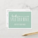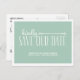 Den här charmerande, land-chic-spara datumkortet innehåller texten "Vänligen spara vårt datum" i två visuella typsnitt. Den söt gröntens bakgrund och det handdragna vita gräns ökar kortets stollig.