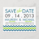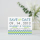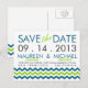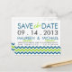 Nautisk teal blue och lime green on white med modern stil zigzag mönster för bröllop och Spara datum meddelande. Byta schevron rand med och fet och trendig sans-serif-typografi. Använda knappen Anpassa för att flytta eller ändra stilar för text.