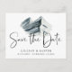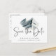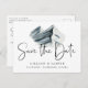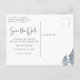 Rustiska vinterberg med vattenfärg, vykort för bröllop spara datum. Kortet har elegantens calligrafi "Save the Date" (Spara datum), framtill och bakåt.