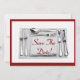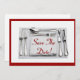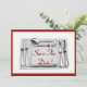 Ett foto med elegant av ställe med silvergods och matcha grått napkin med "Spara datum!" för en unik inbjudan. Anpassa baksidan med din information. Ändra enkelt text, teckensnitt och text och gräns färg. Se matchande frimärke för porto i MVDesigner-arkivet. Perfekt för förlovning, bröllop, återförening och eventuellt party.