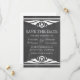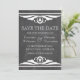 Elegant och chic Deco Chalkboard Spara datum meddelande med ett trendig chalkboard struktur-utseende och ett par av elfenben konst deco swirl gräns. Det här underbara datumet för inbjudan är perfekt för att tillkännage ditt konst deco 1920's themed bröllop. Enkel att anpassa, lägg bara till information om bröllop. Klicka på Anpassa om du vill söka efter ytterligare anpassningsalternativ.