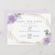 Bröllop spara datum | Geometriska terrariumformer i guld med lavender peonies och benvit magnolias - ett guld-geometriskt multifacetterat terrarium i stil ram adorberat med grönt och blommigt bouquets. Reverse är ett kompletterande samordnat färg. Anpassa text, teckensnitt stil, färg och storlekt. Originalteckningar skapat för BarefootBride™ av © WhimsicalArtwork™ - Detta ingår i en komplett Bröllop Stationery Suite med matchande bröllop, babydusch och andra händelsematerial.