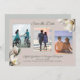 Magnoliablommor save-the-date-kort med tre fotomal. Vita, södra magnoliablommor pryder hörnen på horisontella, rosa beigea färgade kort. Fotomal är trappstegsformade med den vänstra lite högre än mitten och det högra fotot lite lägre. Bilder av båda orienteringar fungerar om motivet är i mitten. "Spara datumet" högst upp, med fullständiga namn, datum och plats för vigseln längst ner. Färgerna matchar den södra magnoliapappersvarukollektionen.