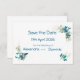 Denna moderna spara-datum-inbjudan har blommotiv och fjärilsmotiv i gröna och blå nyanser.