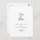 Denna enkla minimalistisk besparing av datumet vykort är perfekt för ett modernt bröllop. Den enkla och elegant designen har skript av typen klassisk och finare i svartvitt.