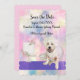 Blandad pastell "Spara datumet"-kort med en illustrerad tårta och en söt vit hund som också kommer att vara en del av bröllopspartiet. Tack till Desicn Cuts och Creative Fabrica för några av elementen i designen.