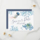 Meddela att du är upptagen med min kust spara datuminbjudan med Spara Datum i ett trendig-skript, typografi stil som framkallar utseendet av handskrift. Detta enkla kort har en kopia av min ursprungliga vattenfärg bläckfisk, stjärnfisk, geléfisk och havskoral i blå nyans. Det finns utrymme för namn, bröllop-datum och bröllop. Kort som är omvänd till komplementär solid marin blue färg. Perfekt för tropiska västindiska, hawaiiska, strand-, kust- och destinationsbröllop. Om du vill se motsvarande bröllop-svit besöker du DotellABelle på Zazzle.