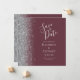 Det moderna bröllop spara datum-kortet från elegantens lämnat kant har ett silver faux glitter gräns. Anpassadet kombinerar handskrift, tryckplåt och kursivt typsnitt med silver grått på en burgundisk bakgrund. Baksidan har en passande burgundi- och silver-design.