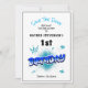 En födelsedagsfest för barn (pojkens) som du kan anpassa med hjälp av funktionen "Anpassa den här mallen" på högerna. Coola blå och svart typografi på vit bakgrund med ljusblå roligt grafik. Alla uppgifter kan anges på baksidan.