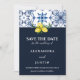 Gratulera till det kommande italienska temat Bröllop med den här eleganten, personlig Spara inbjudan till foto, som är så vackert designad att du fångar romantiken kring Medelhavet! Med en klassisk blå och vit italiensk bricka gräns, levande citroner av Amalfi Kusten gult och ett skarpt vitt typsnitt mot en chic marin blå bakgrund, förkroppsligar inbjudan en tidlös italiensk charm. Lägg till det speciella minnesfotot på baksidan för en romantisk, personlig beröring. Perfekt som en påminnelse till gästerna för din speciella dag. Låt dina gäster känna Italiens värme - för när kärlek är i luft är det Amore!