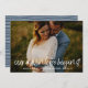 Meddela dina kommande nyheter med det här fotot Spara det datum som innehåller ditt favoritfoto för vågrät och din bröllop-information. "Vårt äventyr börjar" visas vid grund som ett textöverlägg i vit pensel, modern skrivskyddad typografi. Anpassa med din familj namn eller namn under. Kort med omvänt blått färg kan ändras så att det passar dig som fotot färg.