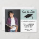 Modern blå Studenten sparar datumfotnoteringskortet. Spara datumkortet för att meddela studentfesten till student. Kortet är blått och vitt och innehåller en studentmössa. Trendiget innehåller text - anpassa all text på kortet med dina data och en fotomall - infoga student i mallen. Ändra datum och annan text på kortets baksida.