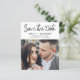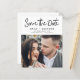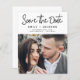 Handskrivet skribentfoto för budgetläge och Elegant sparar Bröllop-kortet för datum. Datuminbjudan innehåller en typografi för chic och snyggt med en enkel och minimalistisk utformning på en vit bakgrund som du kan lägga till ditt anpassade förlovning-fotografi bild till.