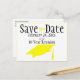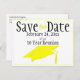 Skicka den här gulten med svart och vitt "Spara datum" för klassåterförening på det här meddelandet om vykort för mallen. Anpassa texten i mallens fält för fram- och tillbaka eller klicka på anpassa för att välja det teckensnitt stil, storleka och färg som du vill använda.